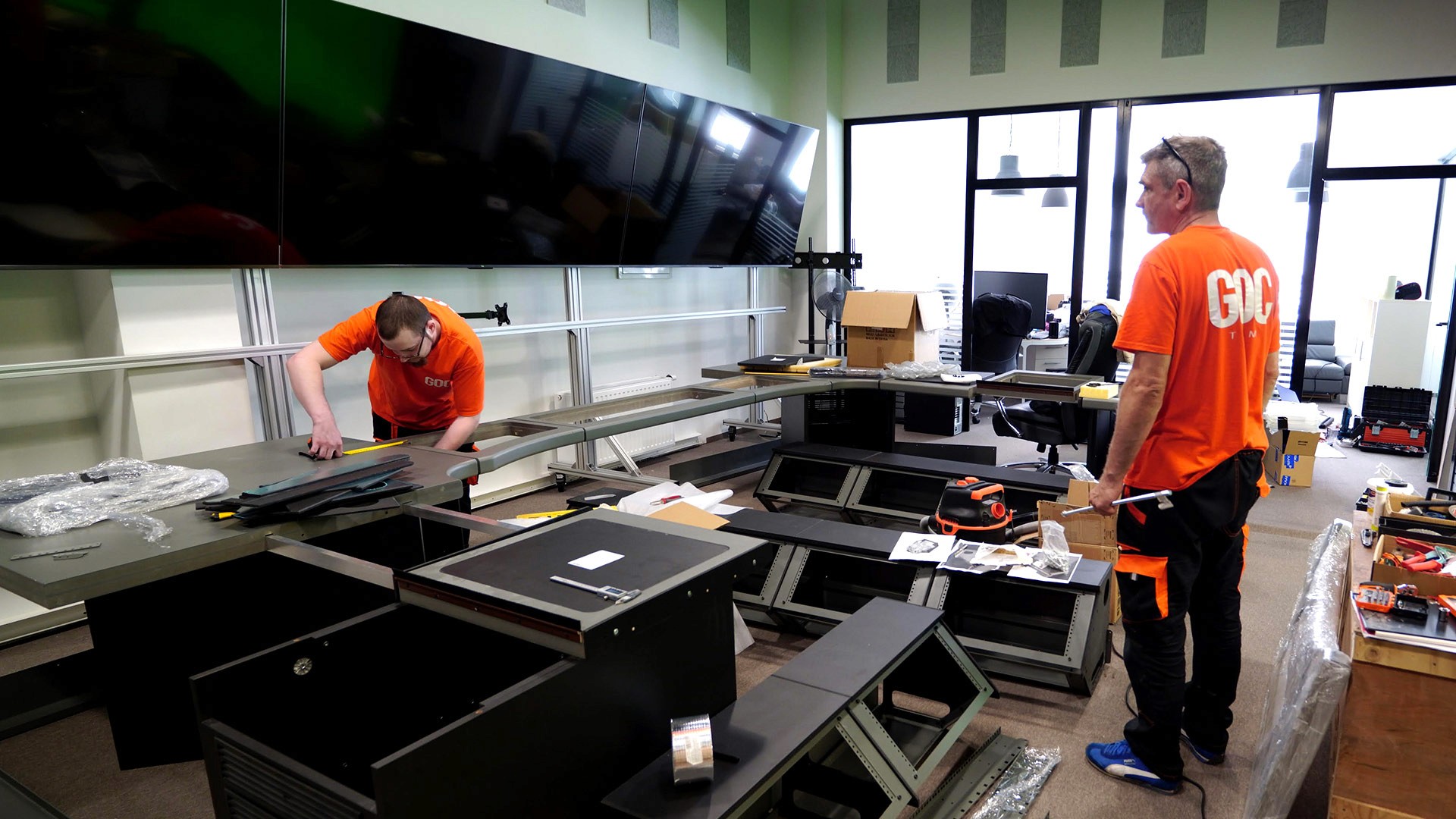 Recognizing the lack of affordable modular table systems on the market that offer the necessary adjustable functionality at an acceptable price, we decided to design and develop our own table system. Our table system features modular components specifically designed for video production, available in light and dark colors, various sizes, and with extensive functionality. The design optimizes and hides wires behind the tabletops, creating a clean and streamlined appearance. Our modular table system includes built-in equipment racks, eliminating the need for additional rack boxes and enhancing the overall functionality and convenience of the tables.